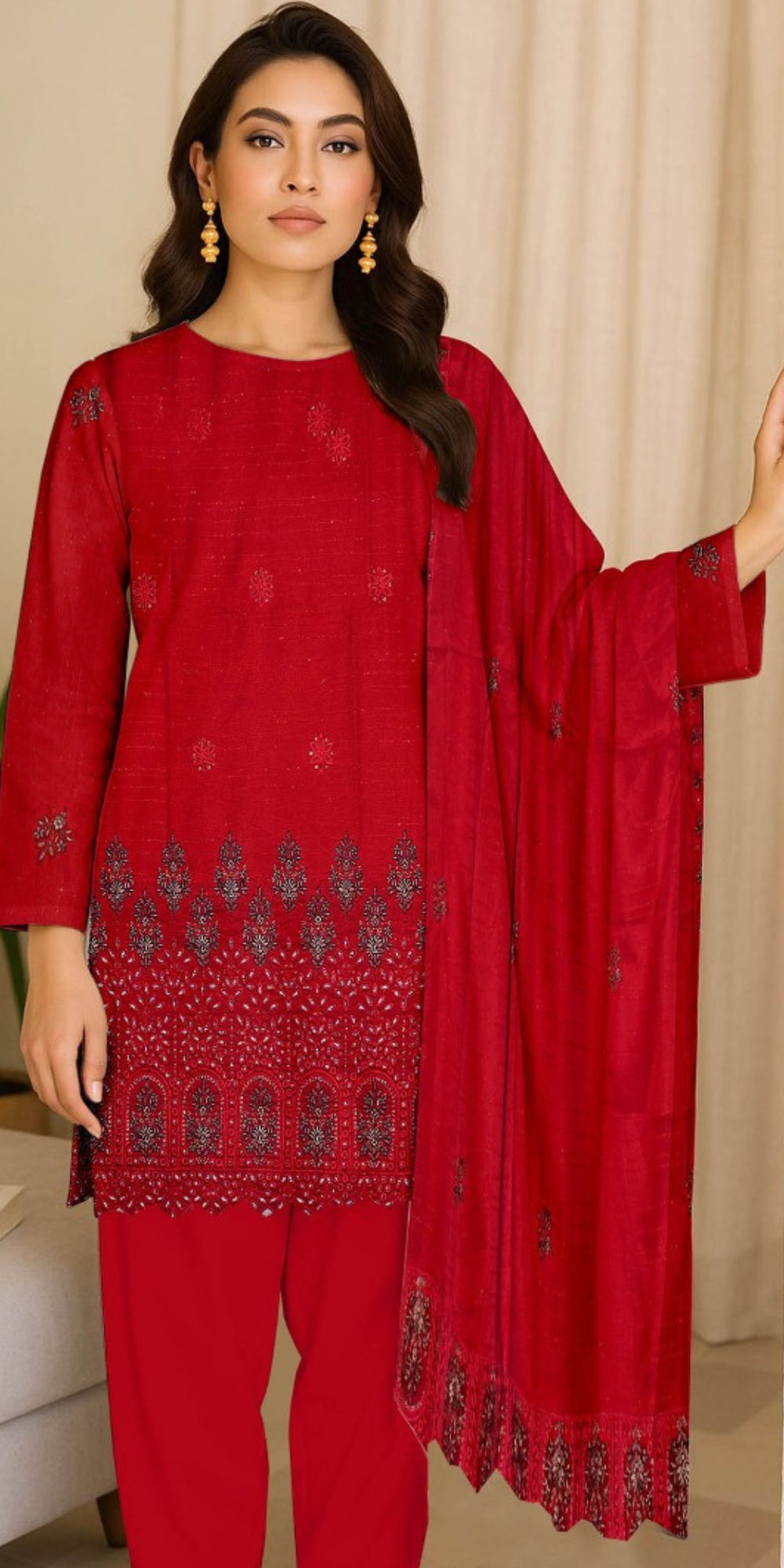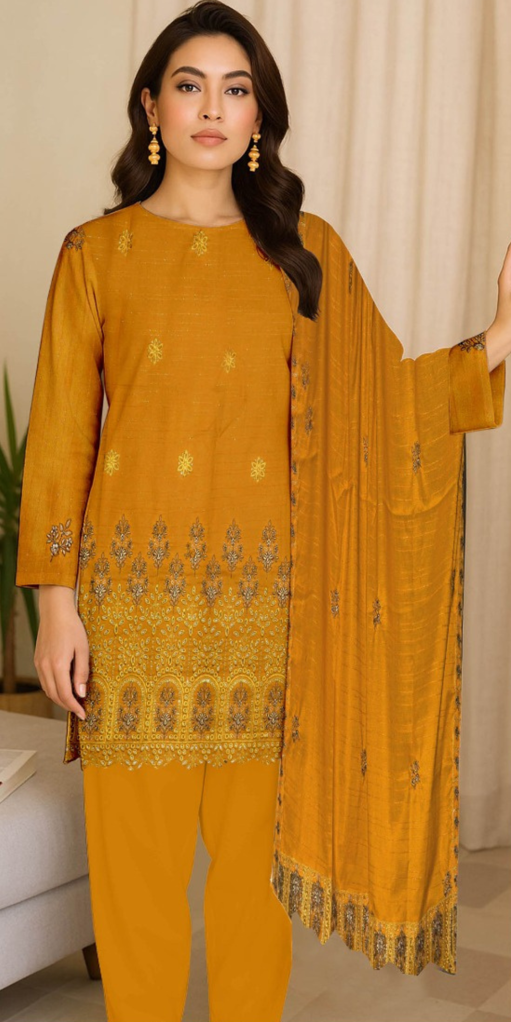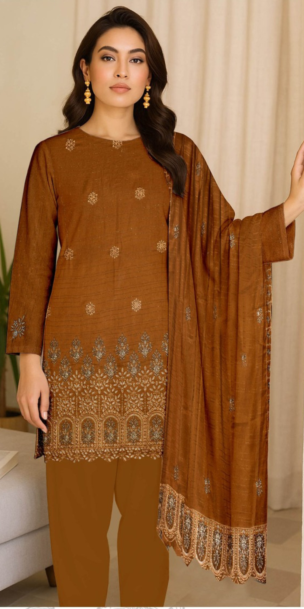 Paired with a Dhanak Jacquard Shawl, the ensemble gains a premium, stylish appeal. The shawl’s jacquard weave adds depth, elegance, and warmth — perfect for completing your winter look. The outfit comes with a Dyed Plain Trouser, ensuring a balanced and graceful silhouette suitable for casual gatherings, festive wear, and semi-formal occasions.