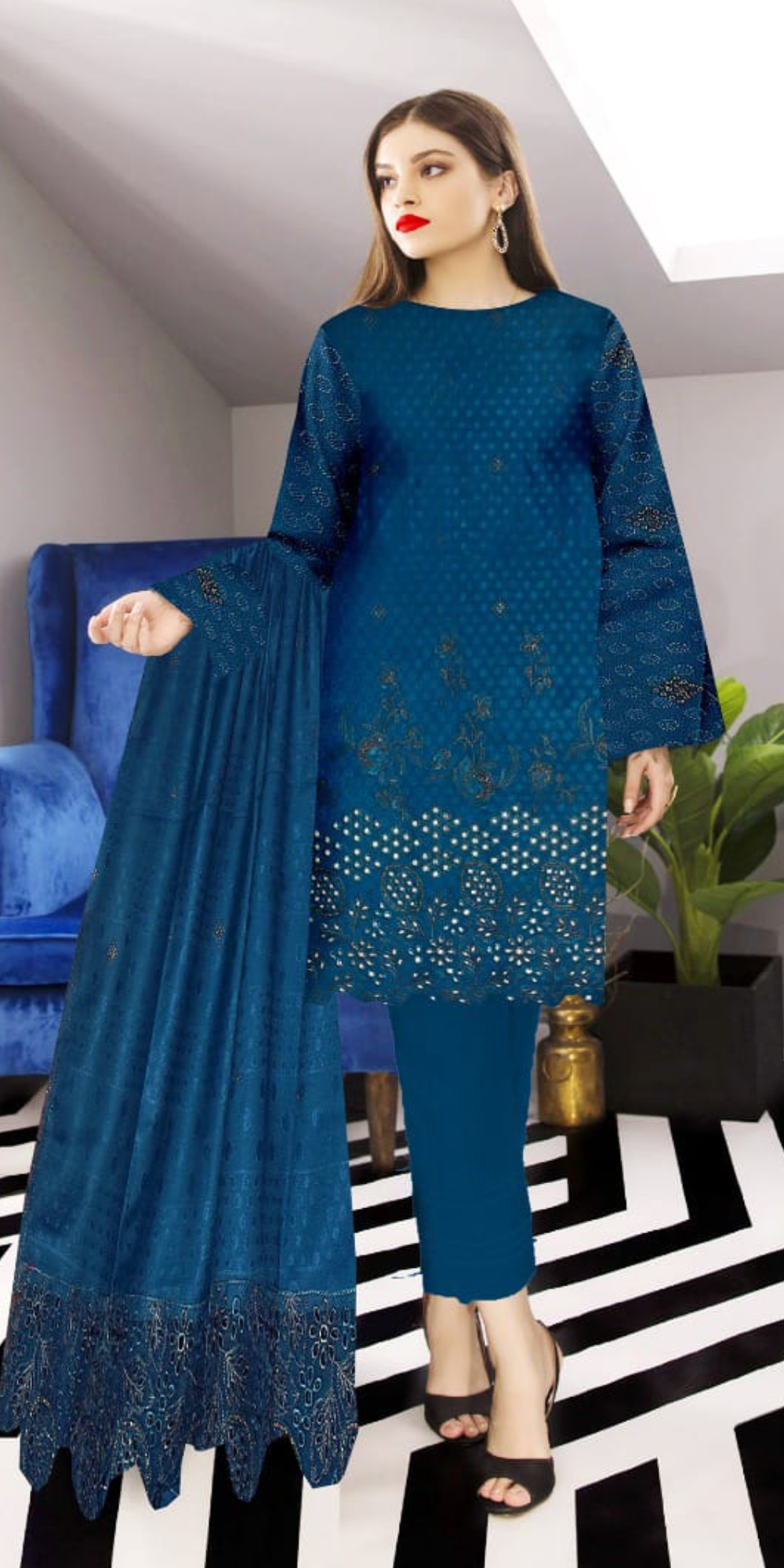 Discover elegance and comfort with this beautifully crafted Fancy Dhanak Jacquard Suit, designed for premium winter wear. The outfit features a luxurious jacquard fabric enhanced with delicate embroidery, giving it a refined and graceful look suitable for casual gatherings, semi-formal events, and everyday winter styling.